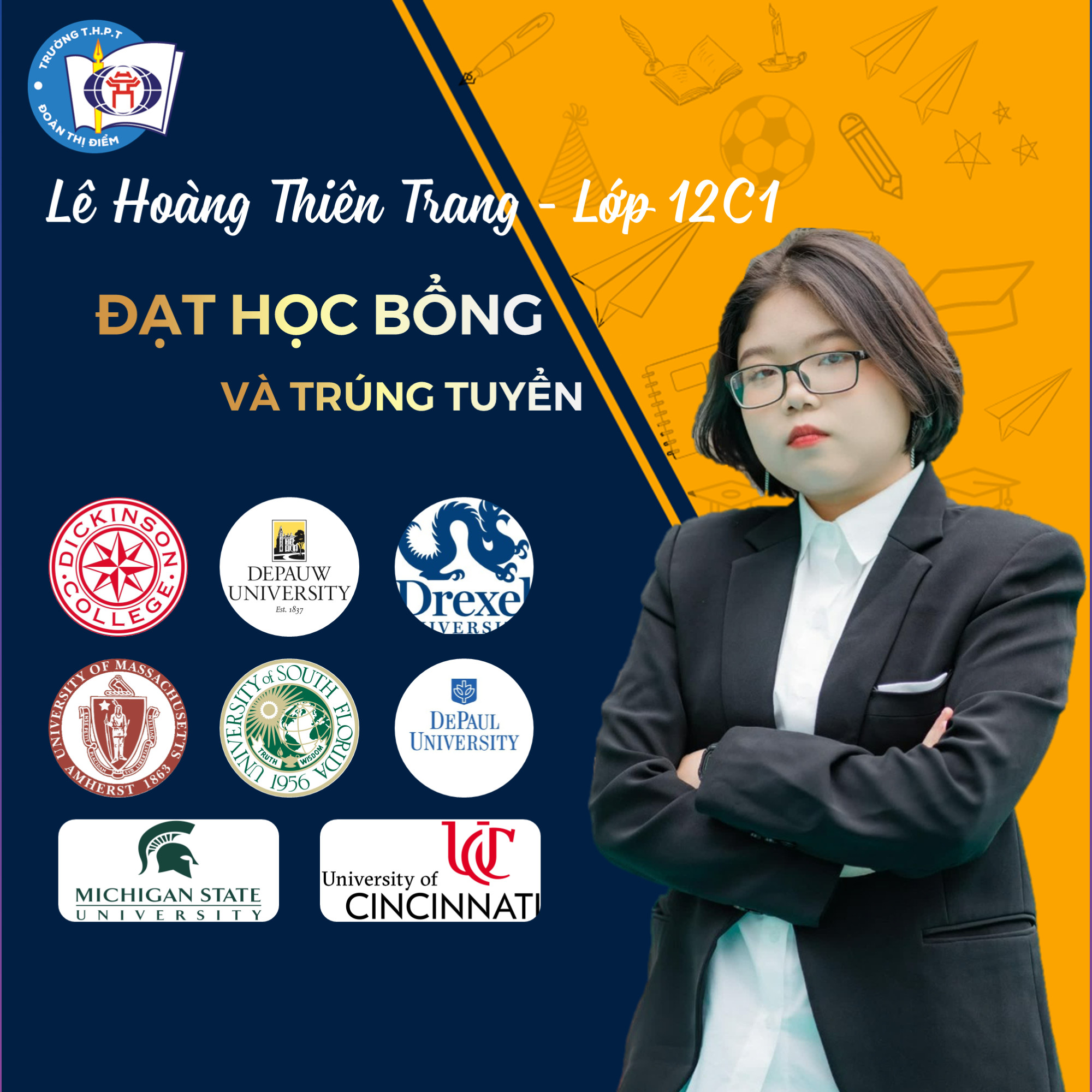 Giành suất học bổng 2 tỷ đồng ngành Quản trị kinh doanh khóa 2015-2019 tại Trường Hult International Business School San Francisco thuộc tốp trường hàng đầu của Mỹ. |