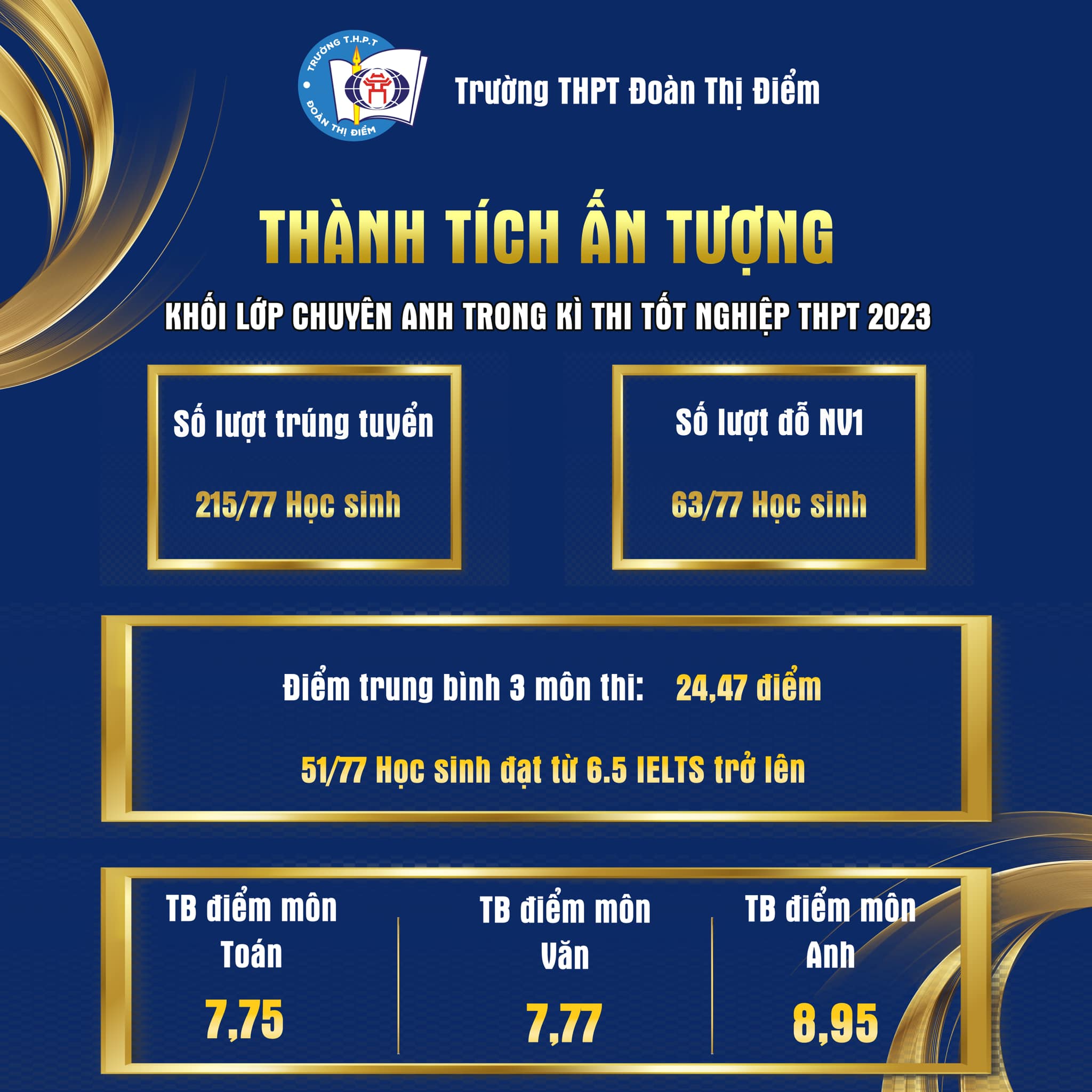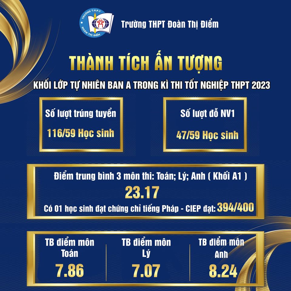 Kể từ khi được thành lập đến nay (20/5/2008), một hành trình đã đạt đến cột mốc đáng ghi nhớ và tự hào – 10 năm cho một ƯỚC MƠ TRỌN VẸN. Trong 10 năm qua, thầy và trò Đoàn Thị Điểm đã đạt được những thành tích đáng tự hào. Đây là thành quả xứng đáng cho tài năng, tâm huyết của những nhà giáo đam mê sự nghiệp trồng người, cho niềm tin yêu hết lòng của phụ huynh, học sinh và cho sự tận tụy của biết bao con người trong ngôi nhà chung Đoàn Thị Điểm.