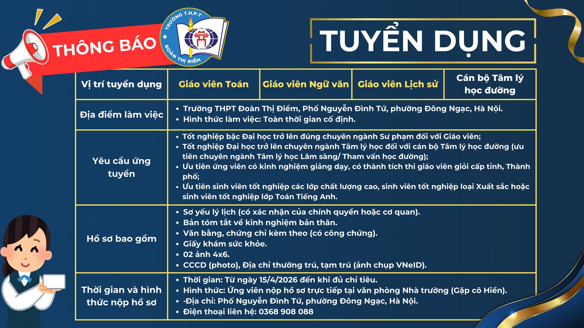 THÔNG BÁO TUYỂN DỤNG NHÂN SỰ – TRƯỜNG THPT ĐOÀN THỊ ĐIỂM 2026